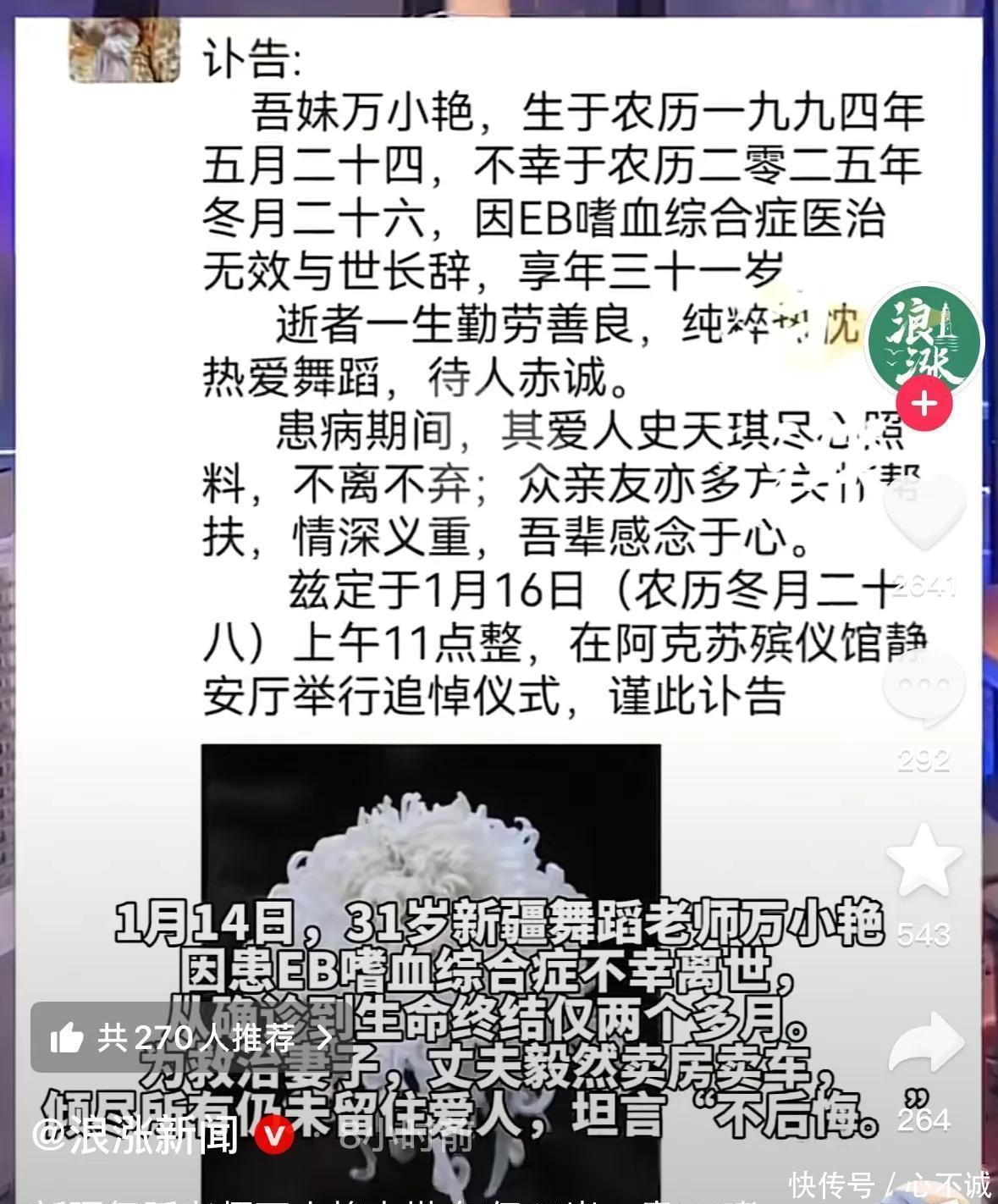 面对人财两空的局面,万小艳的丈夫坦言自己不后悔!坦白说,看到他所说的那三个字都忍不住哽咽了。写在最后:这么好的感情,没能走到最后,实在让人心疼。好在,她们在一起的时候,用尽了全力来爱对方,虽有遗憾,但无悔,是这个悲情故事里唯一温暖人心的地方!一条如此鲜活又美丽的生命就这样逝去了,在此,很难用合适的词汇来表达我的遗憾,只愿万小艳老师一路走好!信息源:(浪涨新闻、万小艳个人账号)